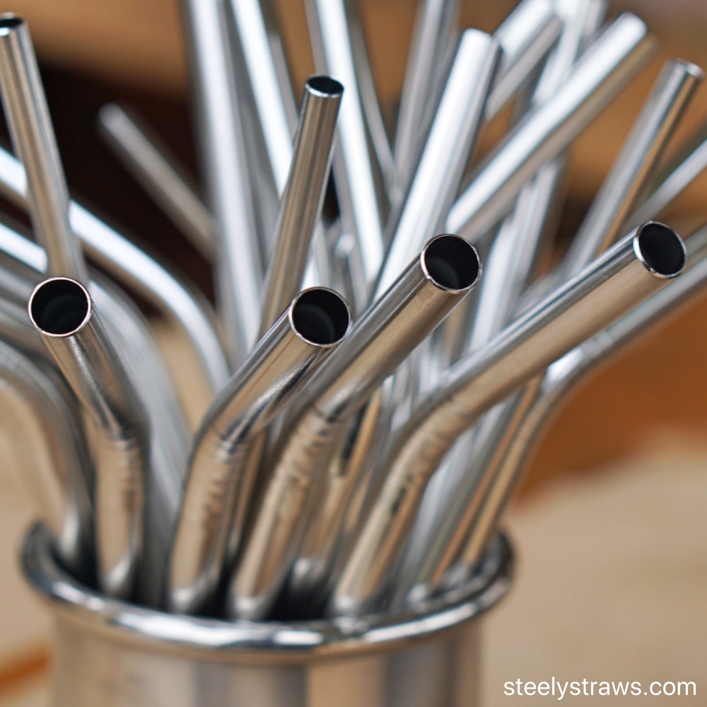 Pricing includes our reusable food grade steel smoothie straws with custom laser engrave imprint on 1 location. Our laser engrave imprint is permanent. Steelys reusable straws are fully dishwasher safe, but they can also be hand washed. Please check out our recommendations on how to clean your reusable straws for practical care instructions. We offer straw cleaner brushes sold separately in bulk. Wash after each use to prolong life and to maintain clean, neutral taste. Safe, clean and non-toxic. Steelys stainless steel straws are fully tested for lead, BPA, phthalates, and are FDA and California Pro 65 compliant. This piece will last for years, is a great way to cut needless plastic straw waste, and is 100% recyclable at the end of its useful life. This product is made responsibly at our vetted factory in China. Ships direct to you from our factory offshore, and pricing listed includes air freight direct to you from our factory offshore, as well as customs and duties, and ground domestic delivery to 1 location in contintental USA. We recommend supervising young children while they use stainless steel straws or other steel utensils. Do Not Microwave stainless steel products. Please see our FAQ for more information.
